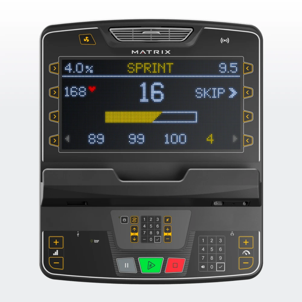 4.2 HP AC motor with Dynamic Response Drive System fine-tunes response based on footfall pattern for a smooth, consistent workout up to 20 km/h / 12 mph. Conveniently placed speed and incline controls provide tactile feedback with each adjustment.