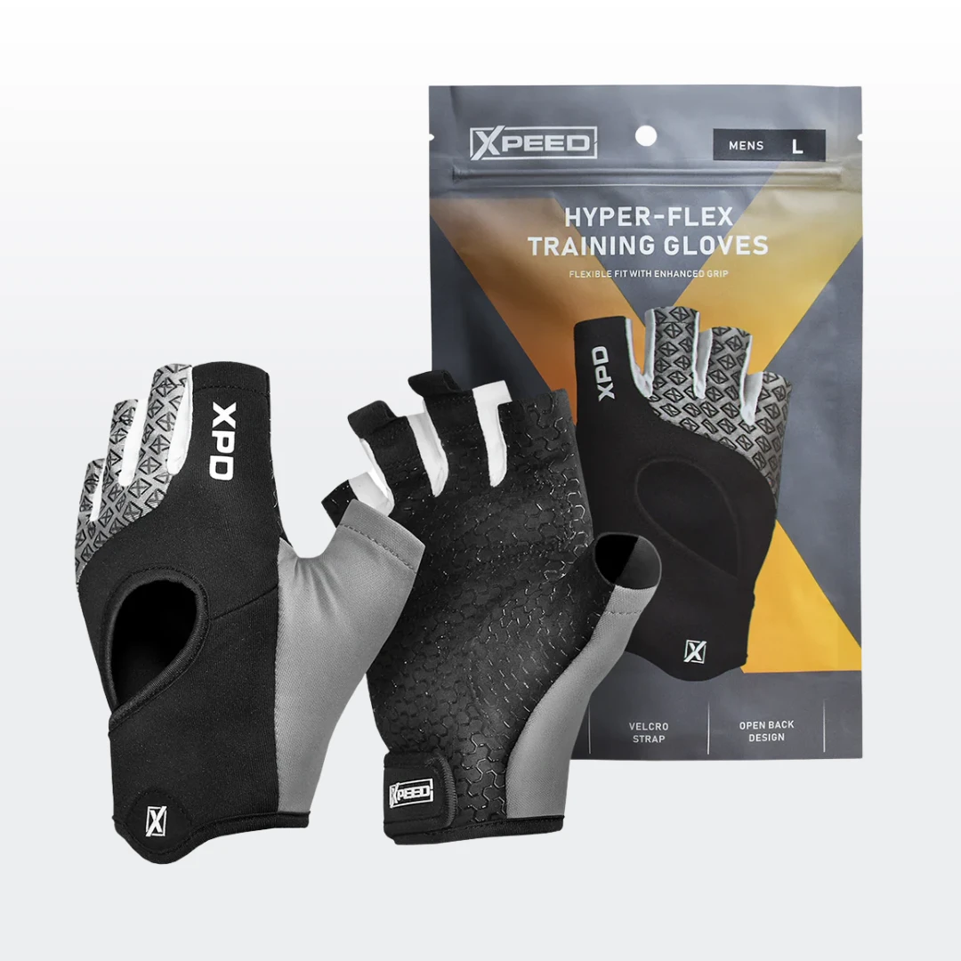 Elevate your training with the Xpeed Hyper Flex Training Gloves designed for flexibility grip and ease of use. The open back design enhances airflow keeping your hands cool and comfortable while the velcro strap ensures a secure fit and easy removal. Featuring a silicone anti slip grip and padded palm these gloves provide superior protection and control for lifting cycling or circuit training. Made from a durable nylon lycra blend with nylon webbing they offer the perfect balance of support and movement.
