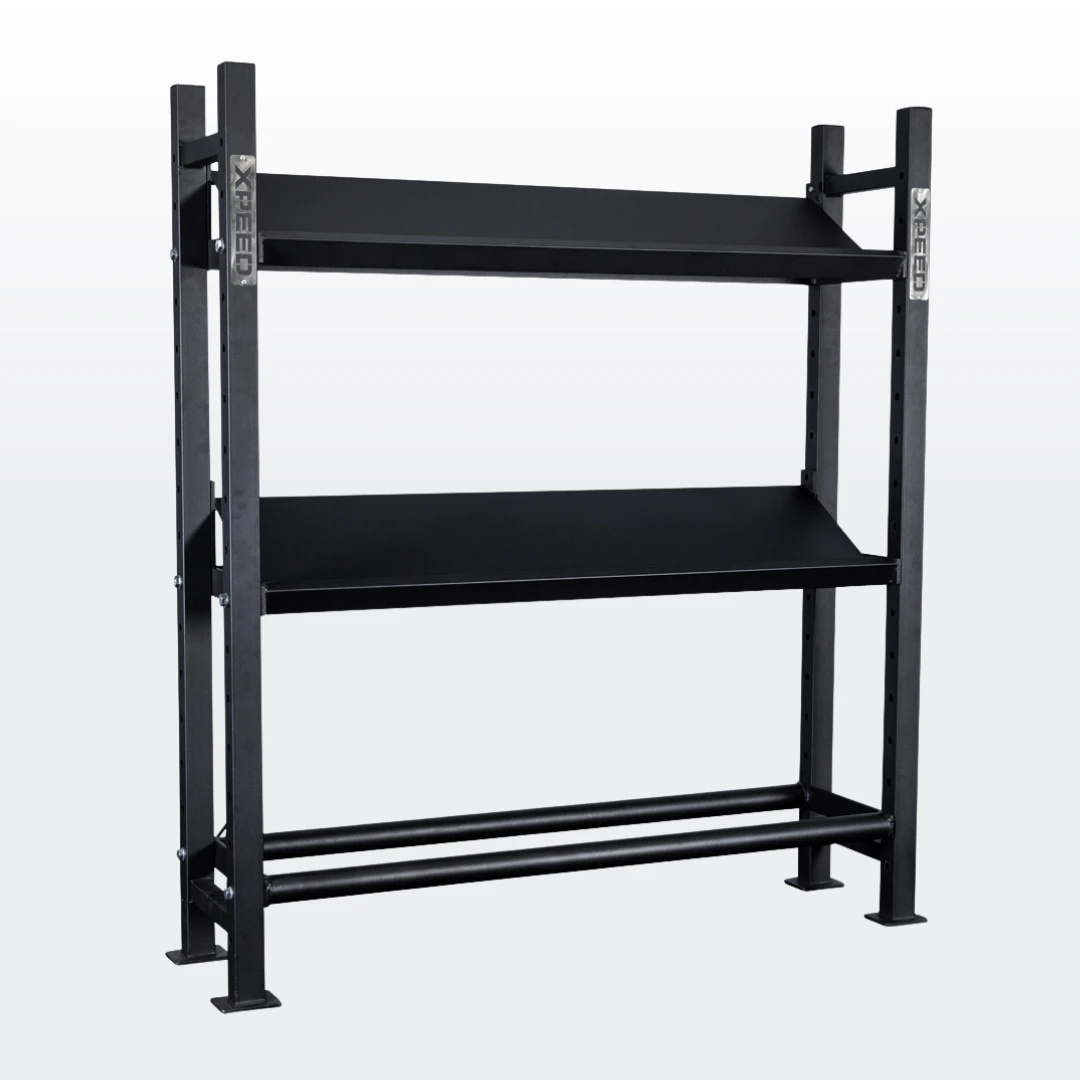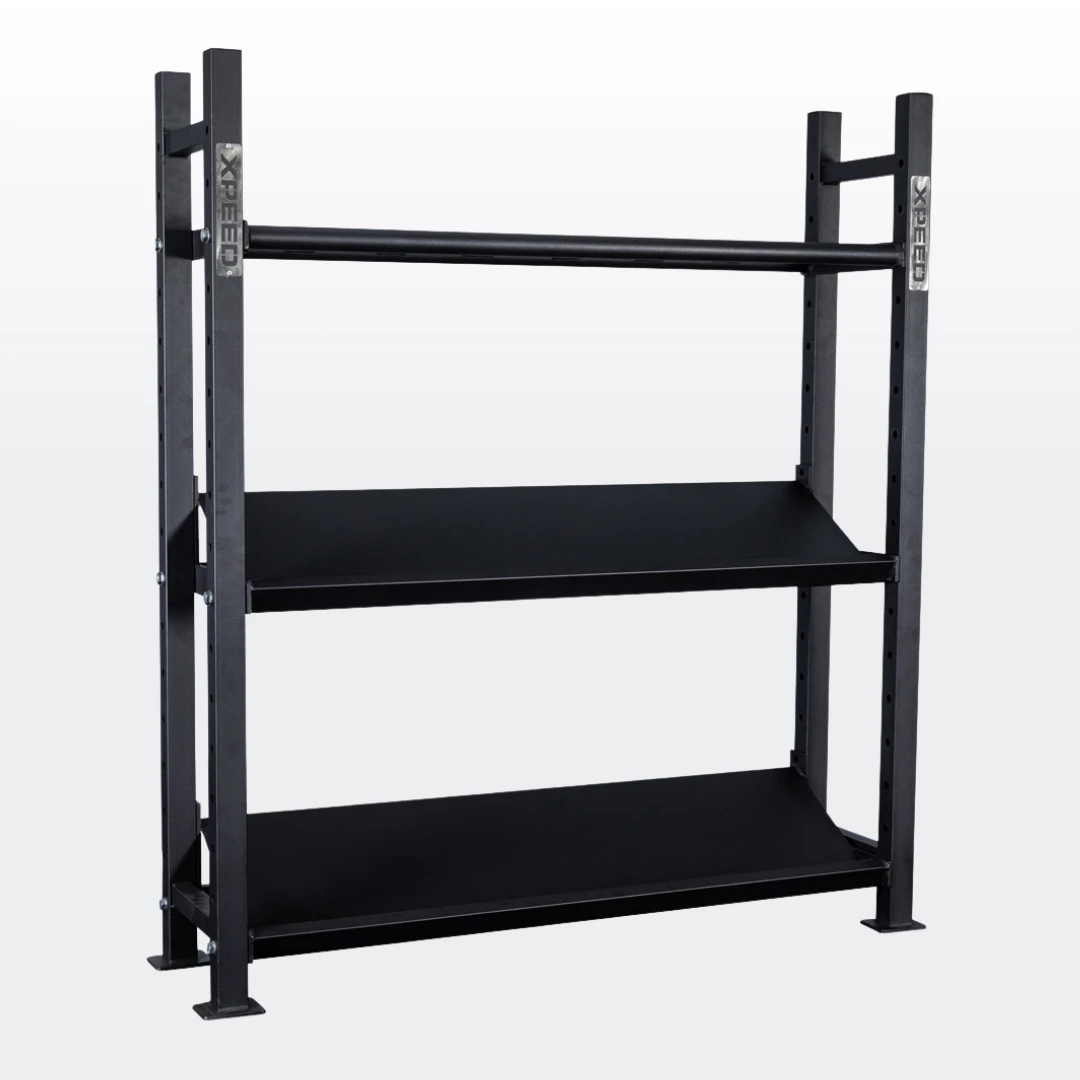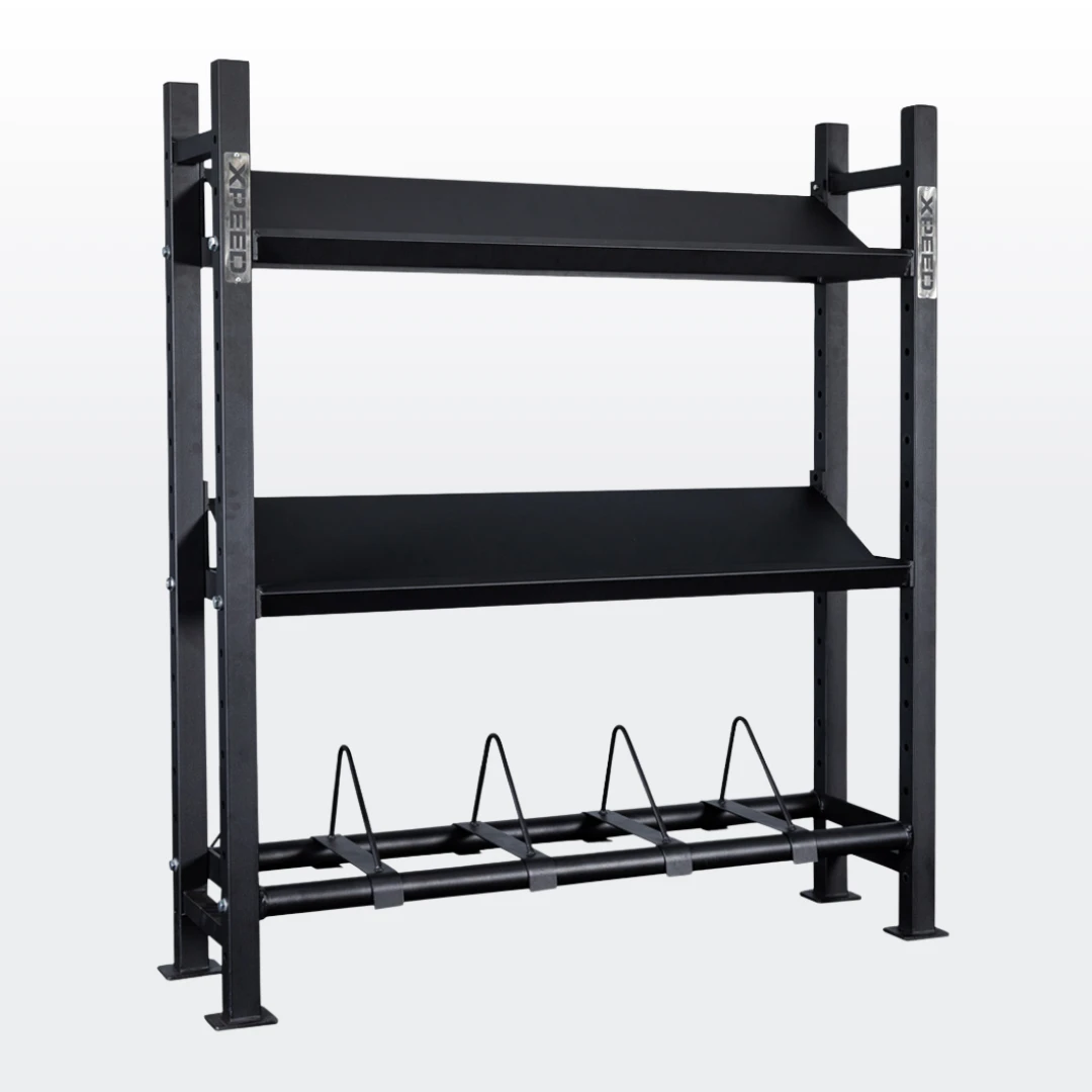 The Xpeed Modular Storage Rack is designed for equipment storage only. It is not suitable as an anchor point for resistance bands, suspension training or any dynamic exercises. For added safety and stability, particularly in commercial settings, we recommend floor anchoring the rack using the flange points on the uprights. Please contact [email protected] for setup support or find a copy of our anchoring instructions here.