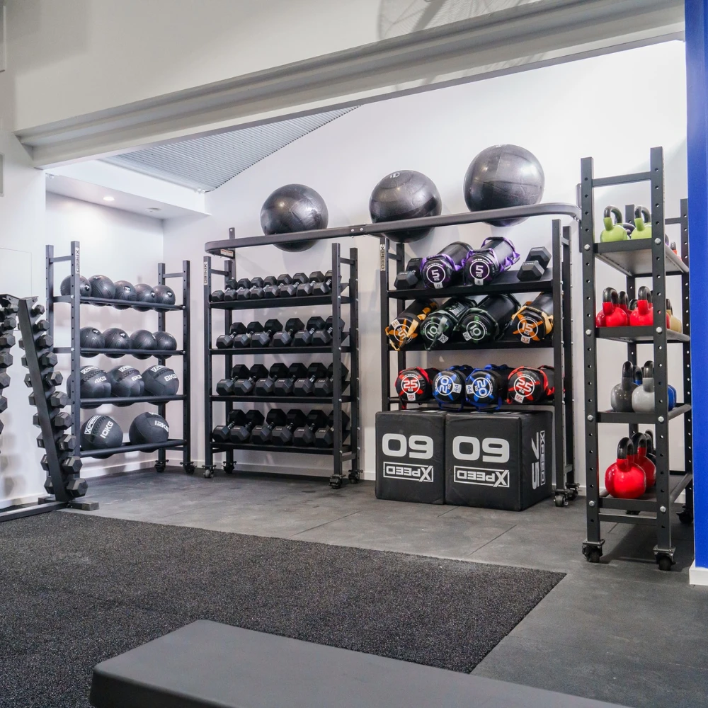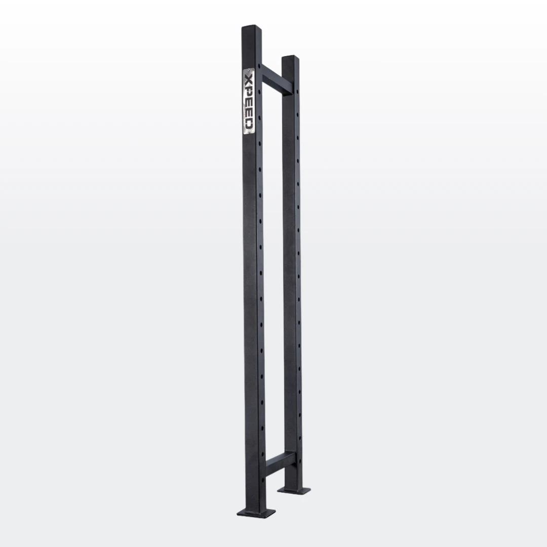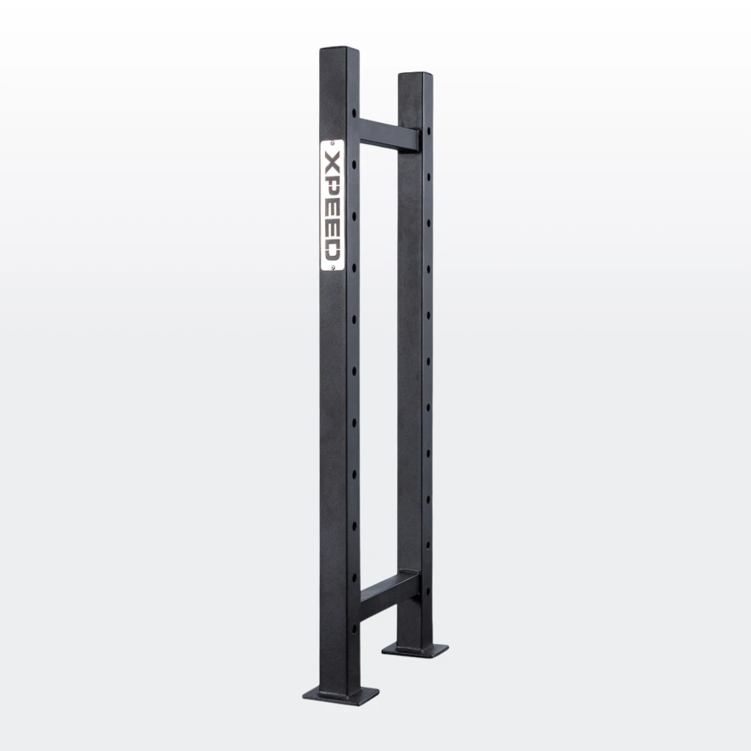 The Xpeed Modular Storage Rack is designed for equipment storage only. It is not suitable as an anchor point for resistance bands, suspension training or any dynamic exercises. For added safety and stability, particularly in commercial settings, we recommend floor anchoring the rack using the flange points on the uprights. Please contact [email protected] for setup support or find a copy of our anchoring instructions here.