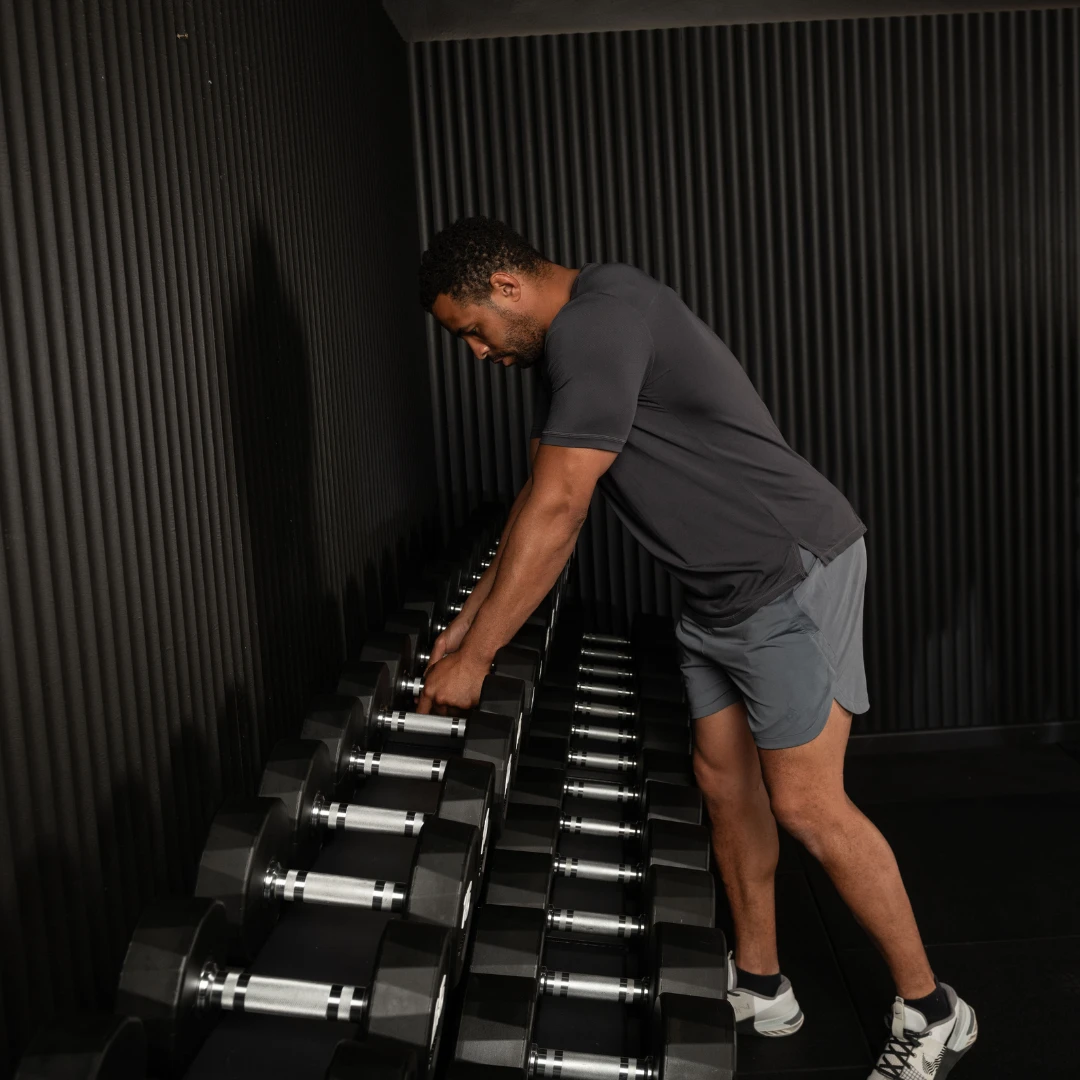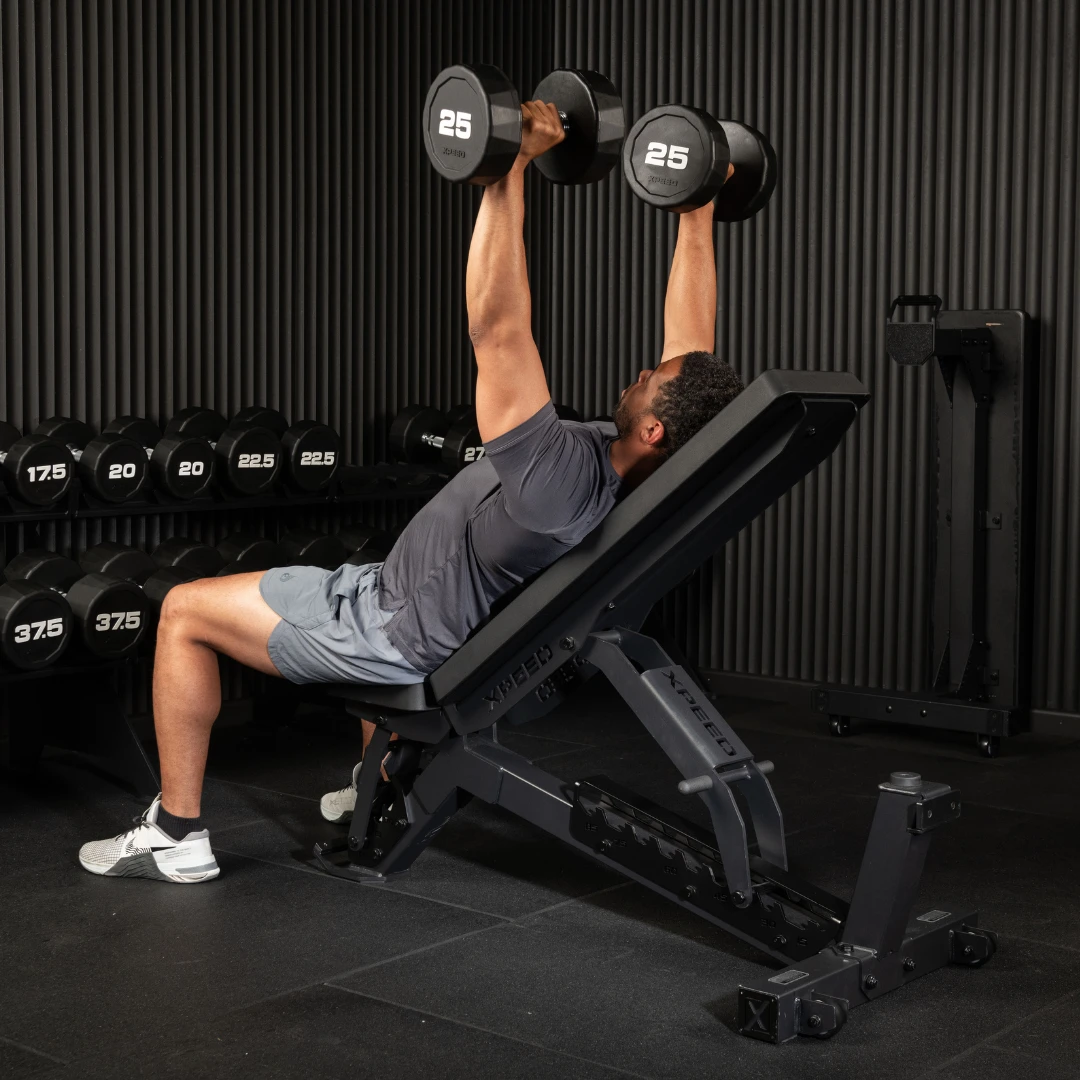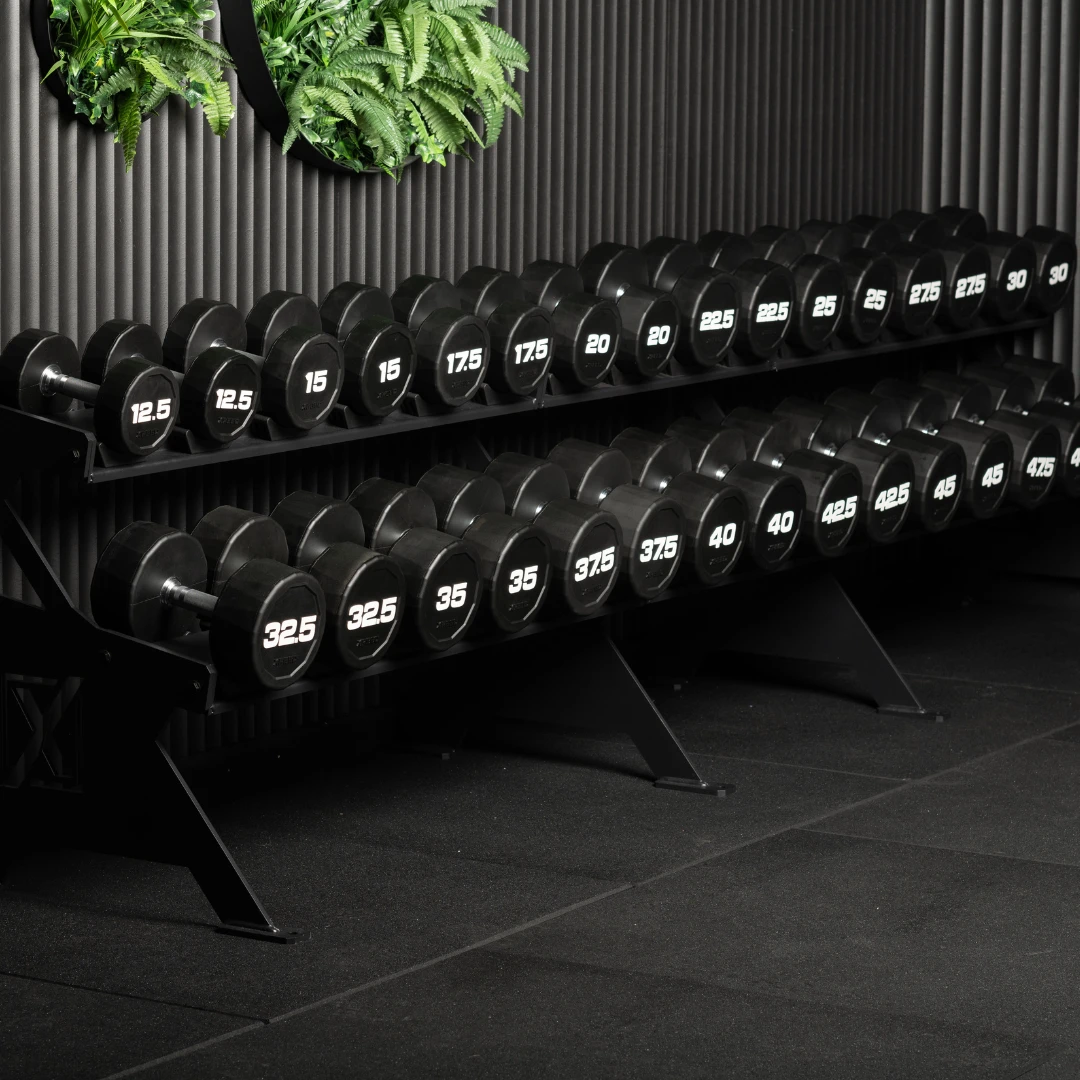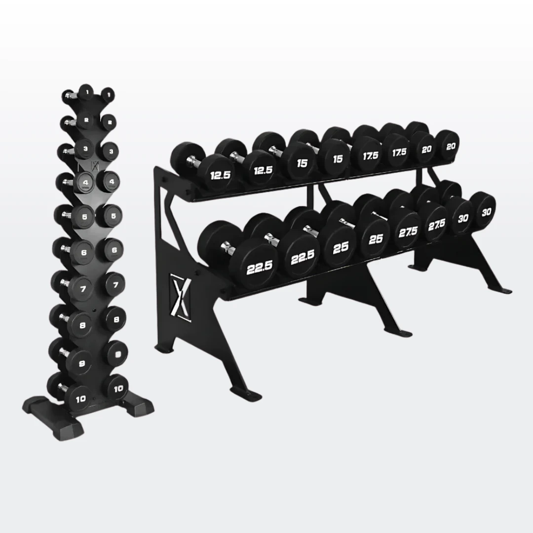 The comprehensive Xpeed Premium 1-30kg CPU Dumbbell Set + Rack combines the best in durability, design and functionality. Featuring CPU round headed dumbbells ranging from 1kg to 30kg, and a dual-part commercial rack, this set is perfect for both serious lifters and commercial environments.Â