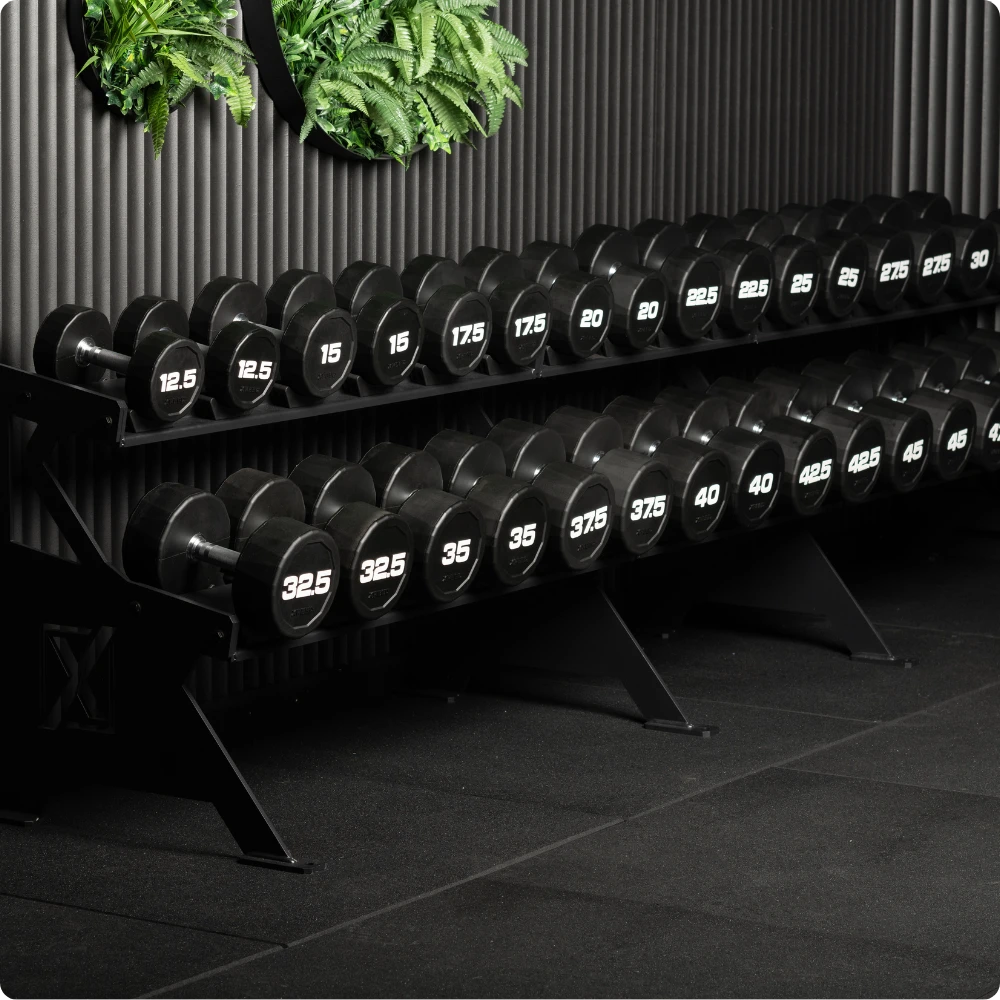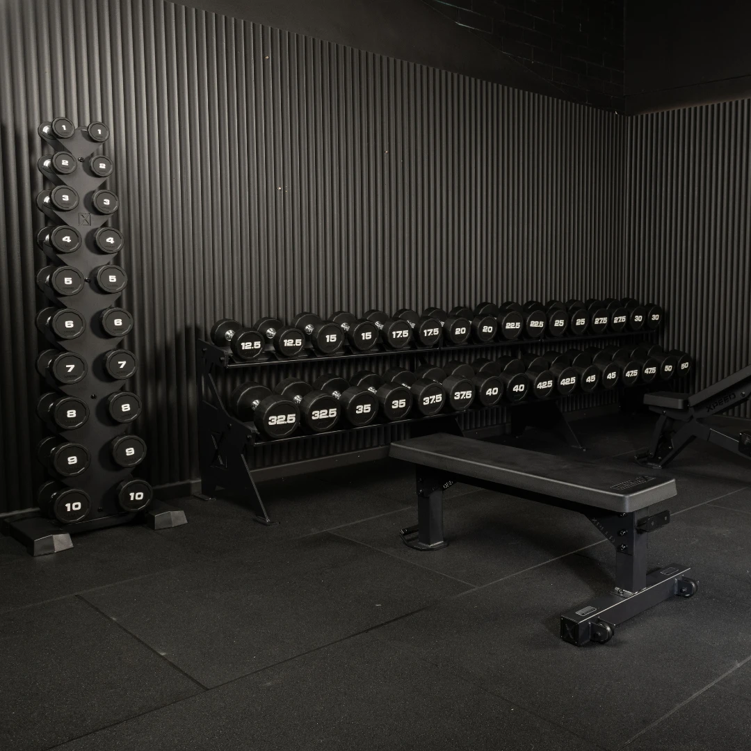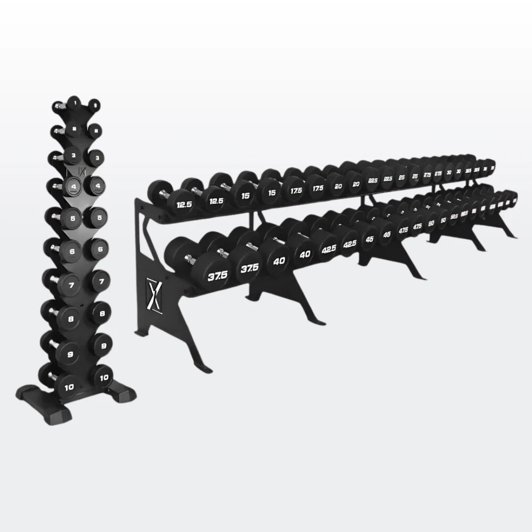 The comprehensive Xpeed Premium 1-60kg CPU Dumbbell Set + Rack combines the best in durability, design and functionality. Featuring CPU round headed dumbbells ranging from 1kg to 60kg, and a dual-part commercial rack, this set is perfect for both serious lifters and commercial environments.Â