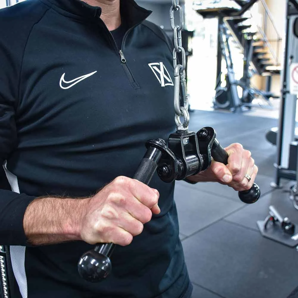 The uniquely designed V Bar enables the user to precisely target the three heads of the tricep (Long, Medial and lateral) through the rotating handle design. This occurs as the tricep is engaged through the natural rotation of the handle in the press motion. It is a fantastic addition to your training tool kit.